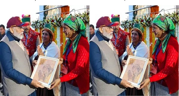 देहरादून। उत्तरकाशी के हर्षिल निवासी अनुप्रिया रावत ने प्रधानमंत्री नरेंद्र मोदी को भोजवासा क्षेत्र के पवित्र भोजपत्र में बनी टकनौरी पेंटिंग भेंट की। प्रधानमंत्री ने पेंटिंग की खूब तारीफ कर अनुप्रिया से ऑर्गेनिक रंगों से बनाई गई पेंटिंग की जानकारी ली। गौरतलब है कि 27 जनवरी को दिल्ली में सीमांत गांव के सरपंचों एवं जनप्रतिनिधियों के सम्मेलन में हर्षिल ग्राम पंचायत के उप प्रधान माधवेंद्र रावत एवं उनकी पत्नी अनुप्रिया रावत ने प्रधानमंत्री नरेंद्र मोदी से मुलाकात कर प्रधानमंत्री को भोजपत्र में बनी खास शैली की टकनौरी पेंटिंग भेंट की। इस कार्यक्रम में देशभर से 1500 पंचायत प्रतिनिधियों ने भाग लिया था। लेकिन प्रधानमंत्री से 10 पंचायत प्रतिनिधियों को मिलने के लिए बुलाया गया।