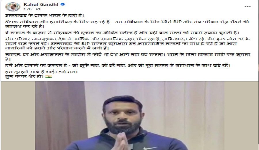 कांग्रेस नेता राहुल गांधी ने एक्स पर दीपक को “भारत का हीरो” बताया। उन्होंने लिखा, “उत्तराखंड के दीपक भारत के हीरो हैं। दीपक संविधान और इंसानियत के लिए लड़ रहे हैं। उस संविधान के लिए जिसे बीजेपी और संघ परिवार रोज रौंदने की साजिश कर रहे हैं। वे नफरत के बाजार में मोहब्बत की दुकान का जीवित प्रतीक हैं… हमें और दीपकों की जरूरत है। हम तुम्हारे साथ हैं भाई। डरो मत। तुम बब्बर शेर हो।” राहुल के इस बयान से विवाद में सियासी रंग घुल गया है।