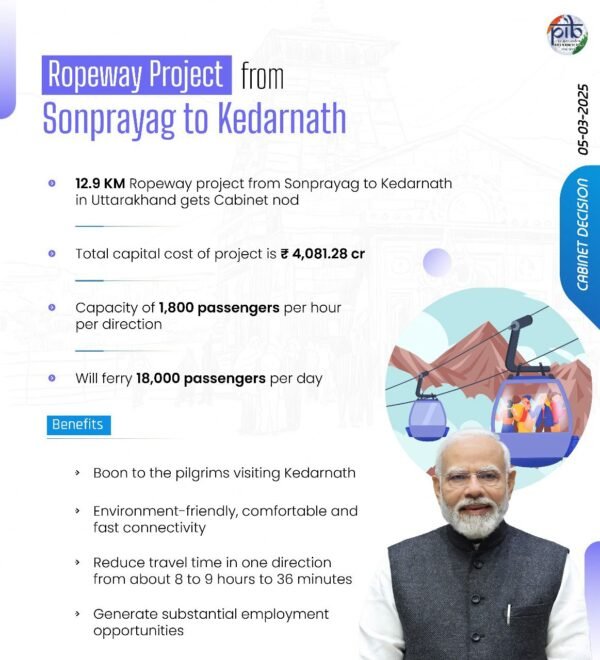 नई दिल्ली : प्रधानमंत्री नरेंद्र मोदी की अध्यक्षता में आर्थिक मामलों की कैबिनेट समिति (सीसीईए) ने सोनप्रयाग से केदारनाथ (12.9 किमी) तक 12.9 किमी रोपवे परियोजना के निर्माण को मंजूरी दे दी है। परियोजना को डिजाइन, निर्माण, वित्त, संचालन और स्थानांतरण (डीबीएफओटी) मोड पर 4,081.28 करोड़ रुपये की कुल पूंजी लागत पर विकसित किया जाएगा।