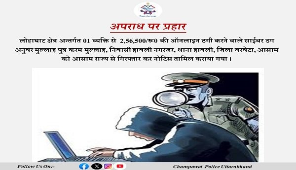 चम्पावत : लोहाघाट क्षेत्र अंतर्गत लोगों से ऑनलाइन ठगी करने वाले 01 ठग को आसाम राज्य से गिरफ्तार कर, नोटिस तामील कराया गया। पुलिस अधीक्षक जनपद चम्पावत अजय गणपति के निर्देशानुसार तथा पुलिस उपाधीक्षक चम्पावत /टनकपुर के पर्यवेक्षण में जनपद चम्पावत में ऑनलाईन ठगी करने वाले अभियुक्तों के विरूद्ध कार्यवाही किये जाने हेतु निर्देशित किया गया है। उक्त के क्रम में जनपद चंपावत के थाना लोहाघाट क्षेत्र अंतर्गत अज्ञात साइबर ठग द्वारा 01 व्यक्ति से 2,56,500/रूपये की ऑनलाइन ठगी की गई थी जिस सम्बन्ध में थाना लोहाघाट में FIR NO-64/2023, U/S-420 IPC बनाम अज्ञात पंजीकृत किया गया । दौराने विवेचना उक्त अभियुक्त आसाम राज्य का होना प्रकाश में आया ।