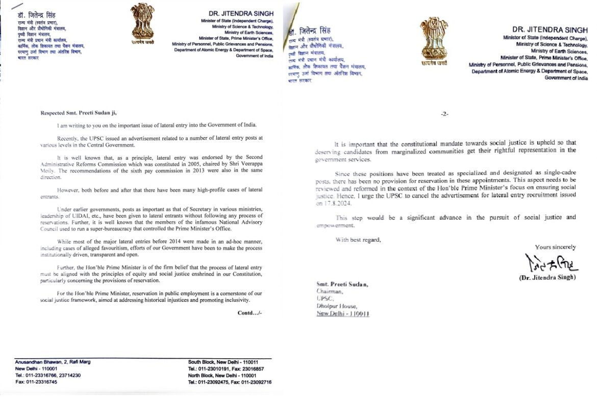 - ”प्रधानमंत्री का यह पुरजोर तरीके से मानना है कि विशेषकर आरक्षण के प्रावधानों के परिप्रेक्ष्य में संविधान में उल्लेखित समानता और सामाजिक न्याय के सिद्धांतों के अनुरूप लेटरली एंट्री की प्रक्रिया को सुसंगत बनाया जाए।”
