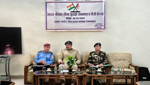 चम्पावत :भारत नेपाल अन्तर्राष्ट्रीय सीमा पर पुलिस अधीक्षक चम्पावत अजय गणपति की अध्यक्षता में की गयी दोनो देशों की सुरक्षा ऐजेन्सियों के साथ भारत-नेपाल सीमा सुरक्षा समन्वय व मैत्री बैठक। दोनो देशों की सुरक्षा ऐजेन्सियों के बीच आपसी समन्वय बनाये जाने व आगामी लोकसभा सामान्य निर्वाचन 2024 को सकुशल सम्पन्न कराये जाने हेतु की गयी बैठक। जनपद चम्पावत के थाना बनबसा क्षेत्रान्तर्गत NHPC गेस्ट हाउस में पुलिस अधीक्षक चम्पावत अजय गणपति की अध्यक्षता में आगामी लोकसभा सामान्य निर्वाचन 2024 के दृष्टिगत जनपद चम्पावत क्षेत्रान्तर्गत लगने वाली भारत-नेपाल अन्तराष्ट्रीय सीमा पर सुरक्षा व्यवस्था बनाये रखने तथा दोनो देशों की सुरक्षा ऐजेन्सियों के साथ आपसी समन्वय बनाये जाने हेतु अन्तराष्ट्रीय सीमा पर नियुक्त दोनो देशो की सुरक्षा ऐजेन्सियों के साथ भारत-नेपाल सीमा सुरक्षा समन्वय व मैत्री बैठक का आयोजन किया गया ।