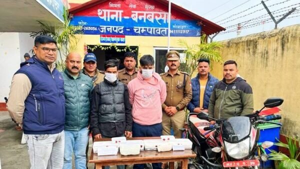 पुलिस अधीक्षक अजय गणपति के निर्देशानुसार 03 फरवरी 2024 को जनपद चम्पावत के थाना बनवसा क्षेत्रान्तर्गत थानाध्यक्ष लक्ष्मण सिंह जगवाण व एस.ओ.जी प्रभारी मनीष खत्री के नेतृत्व में चौकी शारदा बैराज पुलिस टीम व एस.ओ.जी टीम द्धारा संयुक्त चैकिंग के दौरान मलेरिया नाला बैराज बन्धा मार्ग पर मोटरसाइकिल नं0 म2 प 237 में सवार 02 व्यक्तियो क्रमश: 1- राहुल सुनाम पुत्र गणेश सुनाम, निवासी वार्ड नंबर 18 महेन्द्र नगर जिला कंचनपुर नेपाल उम्र 26 वर्ष, तथा 2- सूर्य विक्रम शाह पुत्र वीर बहादुर शाह, निवासी उपरोक्त के कब्जे से क्रमश: अभियुक्त सूर्य विक्रम शाह सें 170 अदद Bhuprenorphine Injection IP REXOGESIC( रैक्सोजैसिक), 170 अदद Promethazine Injection PHENERGAN( फैमारगन), 03.35 ग्राम स्मैक बरामद हुई तथा अभियुक्त राहुल सुनाम से 130 अदद Bhuprenorphine Injection IP REXOGESIC( रैक्सोजैसिक), 130 अदद Promethazine Injection PHENERGAN( फैमारगन), 02.35 ग्राम स्मैक बरामद कर मो0 सा0 रजि0 नं0 म2 प 237 को कब्जे मे लेकर दोनो को नियामानुसार गिरफ्तार किया गया । अभियुक्तगणों के विरूद्ध वैधानिक कार्यवाही करते हुए थाना बनवसा में एनडीपीएस एक्ट की धारा 8/21/60 में मुकदमा पंजीकृत किया गया है ।