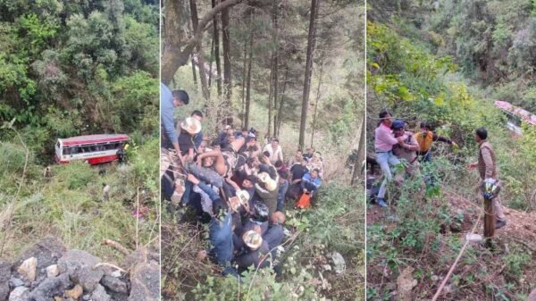 देहरादून: मसूरी में आज दोपहर करीब 12 बजे एक रोड़वेज बस (वाहन संख्या UK07PA-4158) मसूरी- देहरादून रोड़ पर शेरगढ़ी ITBP एकेडमी के नीचे दुर्घटनाग्रस्त होकर खाई में गिर गयी। सूचना पर पुलिस (रस्सी, स्टेचर, गेराविनर) आदि उपकरणो के साथ बचाव व राहत कार्य के लिए घटनास्थल पर पहुंची और थाने से SDRF व फायर सर्विस ITBP व उपजिलाधिकारी को सूचना देकर आवश्यक राहत बचाव कार्य आरम्भ किया। इस दौरान कुल 40 महिला, पुरुष व बच्चो को खाई से निकालकर सड़क पर पहुंचाया गया। जहां से 32 घायलो जिसमें 16 पुरुष 11 महिलाए व 05 बच्चो को 108 व प्राइवेट वाहनो से संयुक्त चिकित्सालय मसूरी भेजा गया और 08 गम्भीर घायलो को (05 महिलाए व 03 पुरुष) को प्राईवेट वाहनो / 108 के माध्यम से देहरादून भेजा गया।