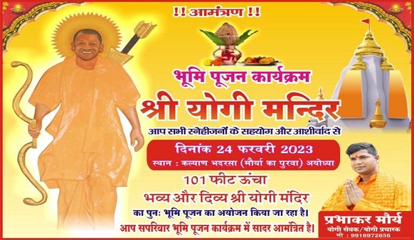 प्रभाकर मौर्य ने कहा कि पुनः परम पूज्य योगी आदित्यनाथ का 101 फीट ऊंचा मंदिर बनाने जा रहे हैं, जिस का भूमि पूजन 24 फरवरी को शुभ मुहूर्त में दोपहर 12:20 पर किया जाएगा। मौर्य ने दावा करते हुए बताया कि मंदिर निर्माण के लिए मुस्लिम समुदाय के लोग अधिक संख्या में सहयोग कर रहे हैं। भूमि पूजन करने के बाद मंदिर निर्माण का कार्य 2027 में पूरा होगा। लगभग 4 करोड़ रुपये की लागत से मंदिर का निर्माण किया जाएगा।