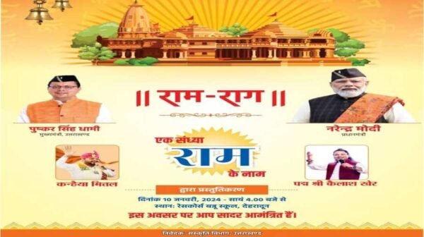 देहरादून। संस्कृति विभाग द्वारा बुधवार (10 जनवरी) को देहरादून के रेसकोर्स स्थित बन्नू स्कूल ग्राउंड में शाम 4 बजे से भव्य सांस्कृतिक कार्यक्रम “राम-राग” आयोजित किया जा रहा है। इस कार्यक्रम में राज्यपाल लेफ्टिनेंट जनरल गुरमीत सिंह (से नि) एवं मुख्यमंत्री पुष्कर सिंह धामी बतौर मुख्यअतिथि प्रतिभाग करेंगे। कार्यक्रम में सुप्रसिद्ध लोक गायक कैलाश खेर एवं कन्हैया मित्तल अपनी प्रस्तुति देंगे। कार्यक्रम की थीम “एक शाम राम के नाम” रखी गई है। इस आयोजन में शामिल होने के लिए निःशुल्क प्रवेश की व्यवस्था की गई है। मुख्यमंत्री पुष्कर सिंह धामी ने कहा कि 22 जनवरी का दिन ऐतिहासिक होगा जब रामलला अयोध्या में विराजमान होंगे। उन्होंने कहा कि उत्तराखण्ड देवभूमि है और यहाँ के कण-कण में देवी-देवताओं का वास है। मुख्यमंत्री ने कहा कि मर्यादापुरुषोत्तम श्री राम चंद्र जी हमें मेहनत, संघर्ष एवं त्याग के साथ ही सत्य के मार्ग पर चलने की प्रेरणा देते हैं।