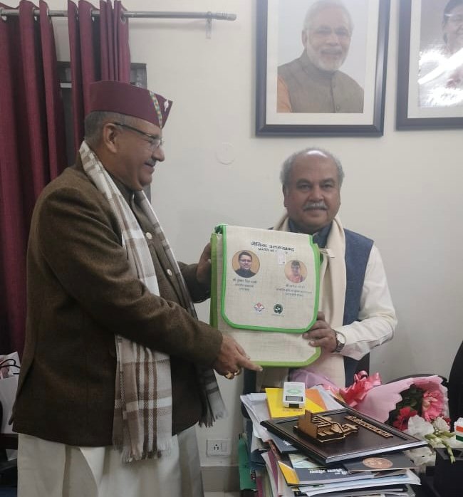 नई दिल्ली । प्रदेश के कृषि मंत्री गणेश जोशी ने बुधवार को नई दिल्ली में केंद्रीय कृषि मंत्री नरेंद्र सिंह तोमर से शिष्टाचार भेंट की। इस अवसर पर मंत्री जोशी ने केंद्रीय कृषि मंत्री नरेंद्र सिंह तोमर को उत्तराखंड के ऑर्गेनिक उत्पाद के साथ ही केदारनाथ मंदिर का स्मृति चिन्ह भी भेंट किया । इस अवसर पर मंत्री जोशी ने केंद्रीय कृषि मंत्री नरेंद्र सिंह तोमर का कृषि एवं किसान कल्याण मंत्रालय, भारत सरकार द्वारा उत्तराखण्ड राज्य को औद्योनिक विकास हेतु जायका परियोजना के माध्यम से रू0 526 करोड़ की धनराशि अवमुक्त करने पर उनका आभार प्रकट किया।