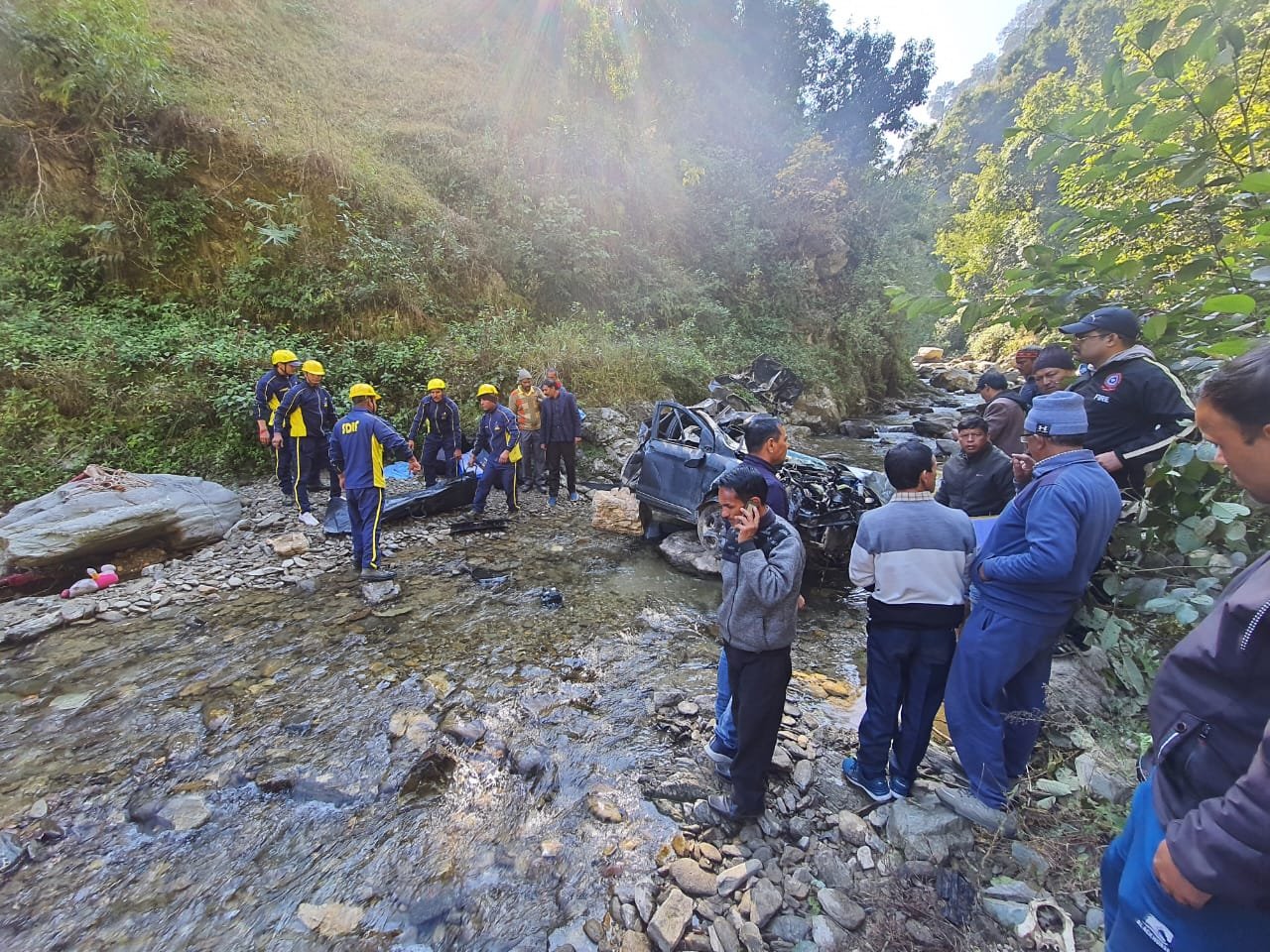 अल्मोड़ा : जनपद अल्मोड़ा में वाहन दुर्घटना- SDRF ने मौके पर चलाया सर्च एंड रेस्क्यू ऑपरेशन। आज 03 दिसम्बर 2022 को जनपद नियंत्रण कक्ष, अल्मोड़ा से एसडीआरएफ को सूचना प्राप्त हुई कि शेराघाड रोड लिगुडता मोड के पास एक बारात की गाड़ी गहरी खाई में गिर गई है। उक्त सूचना पर एसडीआरएफ रेस्क्यू टीम उप निरीक्षक राजेश जोशी के हमराह तत्काल घटनास्थल हेतु रवाना हुई।घटनास्थल पर टीम द्वारा देखा गया कि उक्त वाहन फोर्ड फिएस्टा(वाहन संख्या UK 18H 6578) था,जो सड़क से 100 मीटर नीचे खाई में गिर गया था। वाहन में सात लोग सवार बताए जा रहे है ,जिनमे से तीन को घायल अवस्था मे रेस्क्यू कर अस्पताल पहुंचाया गया व एसडीआरएफ टीम द्वारा 4 शवों को खाई से बरामद कर मुख्य मार्ग तक लाकर राजस्व पुलिस के सुपुर्द किया गया। गौरतलब है कि जयन्त सिंह के पुत्र की शादी में शामिल होने सब बेरीनाग गए थे। शादी के उपरांत वापसी में वाहन अनियंत्रित होकर खाई में गिर गया।