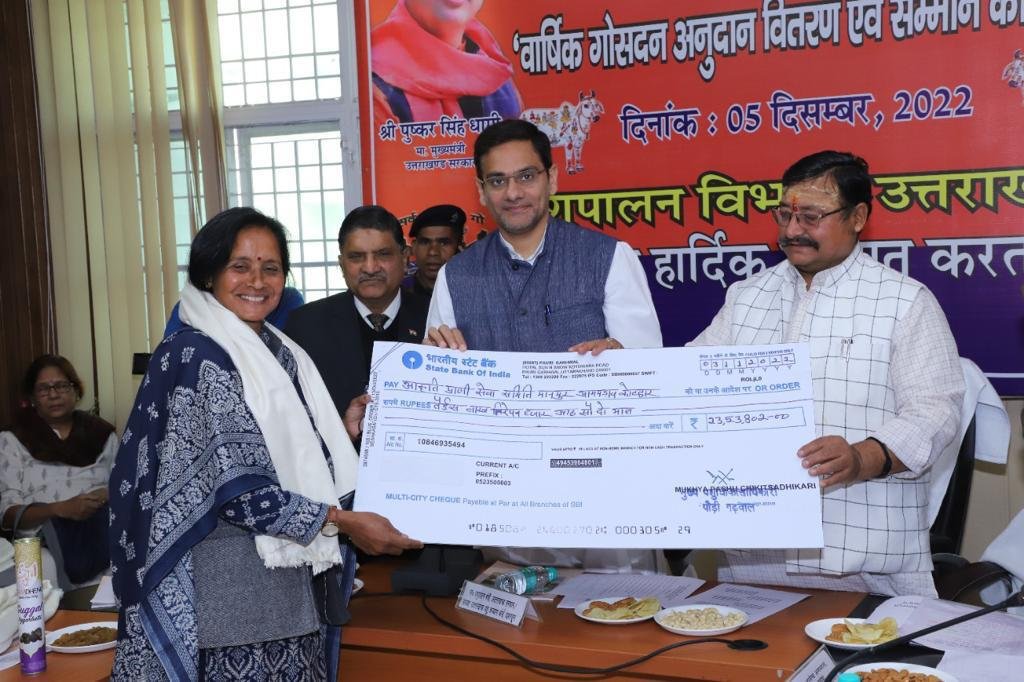 देहरादून : प्रदेश के पशुपालन मंत्री सौरभ बहुगुणा ने सोमवार को पशुधन भवन सभागार में गैर सरकारी संस्थाओं द्वारा संचालित 39 गो सदनों हेतु गोवंश भरण पोषण हेतु 10 करोङ 48 लाख की धनराशि के चेक वितरित किये। विभागीय स्तर पर निराश्रित गो वंश को शरण देने के लिये निर्धारित अर्हता पूर्ण करने वाले मान्यता प्राप्त गैर सरकारी पशु कल्याण संस्थाओं को वार्षिक गो सदन वितरण एवं सम्मान की व्यवस्था के तहत यह धनराशि पशुपालन मंत्री द्वारा वितरित की गई। प्रदेश में शरणागत गोवंश की वार्षिक औसत संख्या 9559 है। कैबिनेट मंत्री सौरभ बहुगुणा ने कहा कि उत्तराखण्ड सरकार द्वारा गोवध एवं गोतस्करी पर प्रभावी रोक तथा समस्त गोवंश का संरक्षण सुनिश्चित किये जाने हेतु उत्तराखण्ड गोवंश संरक्षण अधिनियम पारित किया गया है। अलाभकर गोवंश निराश्रित, अनुत्पादक, वृद्ध, बीमार तथा गोतस्करों से जब्त किये गये गोवंश का संरक्षण गैर सरकारी संस्थाओं के माध्यम से किये जाने की परम्परा को बढ़ावा दिये जाने के उद्देश्य से इन संस्थाओं को गोवंश भरण पोषण एवं निर्माण मद में आशिक राजकीय अनुदान निर्गत किये जाने का निर्णय लिया गया है।