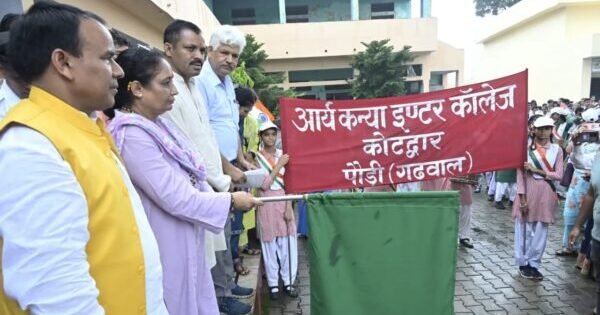 कोटद्वार । आजादी का अमृत महोत्सव के उपलक्ष्य में मेरी माटी मेरा देश कार्यक्रम के अंतर्गत राजकीय बालिका इंटर कॉलेज कोटद्वार में तिरंगा यात्रा निकाली गई। कैबिनेट मंत्री धन सिंह रावत और विधानसभा अध्यक्ष ऋतु खण्डूडी भूषण ने शहीदों को श्रद्धांजलि अर्पित करते हुए तिरंगा यात्रा को हरी झंडी दिखाकर रवाना किया। यात्रा आर्य कन्या इंटर कॉलेज से आरंभ होकर अमर शहीदों के जयकारे लगाते हुए नगर निगम सभागार पहुंची। जहां उच्च शिक्षा मंत्री धन सिंह रावत और विधानसभा अध्यक्ष ऋतु खण्डूडी ने मेरी माटी मेरा देश कार्यक्रम का शुभारंभ विधिवत दीप प्रज्वलित कर किया। इस दौरान छात्र छात्राओं ने सांस्कृतिक कार्यक्रम प्रस्तुत किए।