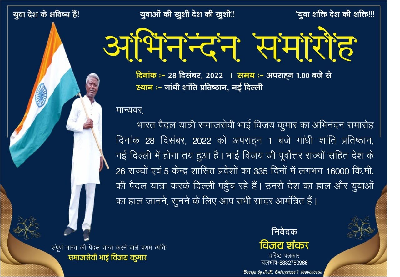 नई दिल्ली : सम्पूर्ण भारत की पैदल यात्रा कर रहे हैं बिहार के समाजसेवी विजय कुमार 28 दिसंबर को देश की राजधानी दिल्ली में पहुंच रहे हैं । दिल्ली में उनके स्वागत में एक अभिनंदन समारोह का आयोजन गांधी शांति प्रतिष्ठान में अपराहन 1:00 बजे से किया गया है । इस अभिनंदन समारोह में समाजसेवी विजय कुमार अपने पूरे 335 दिनों की यात्रा के अनुभव और पूर्वोत्तर भारत जैसे दुर्गम क्षेत्र के यात्रा अनुभव साझा करेंगे । इस 335 दिनों की भारत पैदल यात्रा में समाजसेवी विजय कुमार ने 26 राज्यों एवं 5 केंद्र शासित प्रदेशों का भ्रमण करते हुए लगभग 16000 किलोमीटर की पैदल यात्रा पूरी की है और देश के युवाओं को जागृत करने का काम किया है । इसके अतिरिक्त समाजसेवी विजय कुमार राजघाट स्थित राष्ट्रपिता महात्मा गांधी के समाधि स्थल पर जाकर 11 बजे पूर्वाह्न से 2.00 बजे अपराह्न तक , 3 घंटे तक बैठकर अपनी आत्म शुद्धि करेंगे और इस दौरान कुछ भी खान-पान नहीं करेंगे । इसके बाद अगले दिन जंतर-मंतर पर 2 दिनों का अनशन करने का उनका कार्यक्रम निर्धारित है और इसकी अनुमति मिलने के बाद वह 2 दिनों का अनशन 30 दिसंबर और 31 दिसंबर को सुबह 11:00 बजे दिन से जंतर मंतर पर करेंगे ।