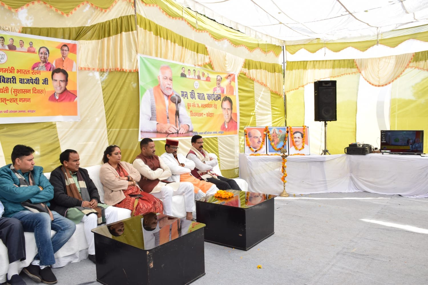कोटद्वार । भाजपा कार्यकर्ताओं ने रविवार को पूर्व प्रधानमंत्री अटल बिहारी वाजपेयी के जन्मदिवस एवं मन की बात कार्यक्रम को सुनने के लिए कैंप कार्यालय पर कार्यक्रम आयोजित किया गया । जिसकी अध्यक्षता विधानसभा अध्यक्ष ऋतु खंडूरी ने की। कार्यक्रम में मुख्य अतिथि शिक्षा एवं स्वास्थ्य मंत्री डॉ धन सिंह रावत मौजूद रहे । सुशासन दिवस पर पूर्व प्रधानमंत्री अटल बिहारी वाजपेयी की तस्वीर पर फूल माला अर्पित करने के साथ देश के प्रति उनके योगदान के बारे में चर्चा की गई।