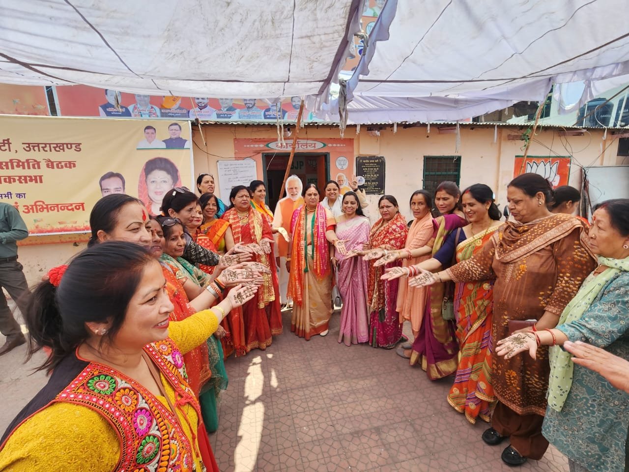 देहरादून। चैत्र नवरात्रि के पावन पर्व पर भाजपा महिला मोर्चा ने कमल मेहंदी अभियान की शुरुआत की है भाजपा महानगर कार्यालय में कार्यक्रम का आयोजन किया गया जिसमें भाजपा महिला मोर्चे के कई पदाधिकारियों और कार्यकर्ताओं ने हिस्सा लिया। भाजपा महिला मोर्चा के प्रदेश अध्यक्ष आशा नौटियाल का कहना है कि पूरे प्रदेश में कमल मेहंदी लगाने के अभियान की शुरुआत हुई है उनका कहना है कि जगह-जगह कार्यक्रम का आयोजन किया जा रहा है। जिसमें पदाधिकारी कार्यकर्ता हिस्सा ले रहे हैं साथ ही स्थानीय महिलाओं को भी आमंत्रित किया जा रहा है।