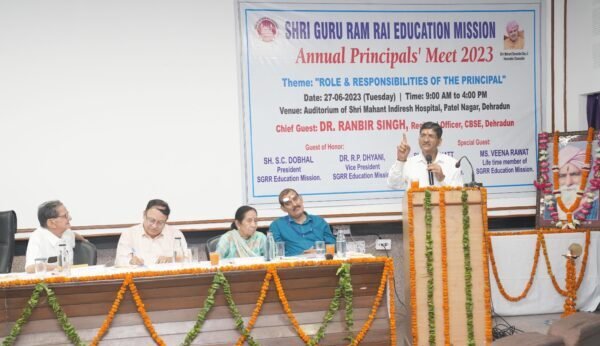 श्री गुरु राम राय एजकेशन मिशन के अन्तर्गत संचालित एसजीआरआर स्कूलों की वार्षिक प्रधानाचार्य अधिवेशन का मंगलवार को आयोजन किया गया। श्री महंत इन्दिरेश अस्पताल के सभागार में प्रधानाचार्यों की भूमिका एवम् उत्तरदायित्व विषय पर आधारित कार्यक्रम का शुभारंभ मुख्य अतिथि डाॅ रणवीर सिंह, क्षेत्रीय निदेशक, सीबीएसई, देहरादून ने दीप प्रज्जवलित कर किया। एसजीआरआर पटेल नगर की छात्राओं ने सरस्वती वंदना से कार्यक्रम को भक्तिमय बना दिया। विजय नौटियाल, अधिकृत हस्ताक्षरी प्रबन्धक एसजीआरआर एजुकेशन मिशन ने स्वागत अभिभाषण से कार्यक्रम का शुभारंभ किया। मुख्य अतिथि डाॅ रणवीर सिंह ने कहा कि स्कूलों में शिक्षा का ऐसा माॅडल तैयार किया जाना चाहिए कि कोचिंग सेंटरों में जाकर बच्चे को कोचिंग का सहारा न लेना पड़े। उन्होंने एसजीआरआर एजुकेशन मिशन के स्कूलों की सराहना करते हुए एसजीआरआर स्कूलों को गुणवत्तापरक शिक्षा का माॅर्डन एवम् आधुनिक सेंटर बताया। शिक्षक व अभिभावक बच्चों के ज्ञान स्तर बढ़ाने के लिए मोबाइल के स्थान शैक्षणिक पोर्टल व एजुकेशनल चैनलों को प्राथमिकता दें।