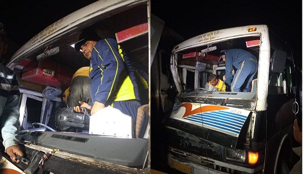 टिहरी : जनपद टिहरी के ब्यासी के पास बस और ट्रक की हुई भिड़ंत, SDRF ने बस में फंसे चालक का किया सकुशल रेस्क्यू। 04 दिसंबर 2023 की देर रात्रि पुलिस चौकी ब्यासी द्वारा SDRF को सूचित किया गया कि ब्यासी के पास एक ट्रक और बस की आमने सामने टक्कर हो गयी है। उक्त सूचना मिलते ही SI नीरज चौहान के नेतृत्व में SDRF टीम द्वारा तत्काल घटनास्थल पर पहुँचकर बचाव अभियान आरम्भ किया गया। उक्त घटना में बस चालक बस में ही फंस गया था जो वहाँ से निकलने में असमर्थ था। SDRF टीम द्वारा तमाम मुश्किल हालात को दरकिनार कर सावधानीपूर्वक कटिंग इक्विपमेंट का प्रयोग करते हुए बस चालक को सकुशल रेस्क्यू कर बाहर निकाला व उपचार हेतु अस्पताल भिजवाया गया।