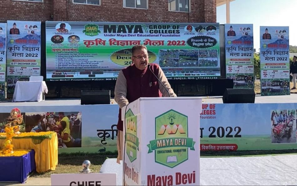 देहरादून । प्रदेश के कृषि मंत्री गणेश जोशी मंगलवार को सेलाकुई स्थित माया ग्रुप आफ कालेजेस में दो दिवसीय कृषि विज्ञान मेले में बतौर मुख्य अतिथि प्रतिभाग कर कार्यक्रम का शुभारंभ किया। इस अवसर पर कृषि मंत्री गणेश जोशी ने वहां लगे विभिन्न स्टालों का भी निरीक्षण किया। अपने सम्बोधन में कृषि मंत्री गणेश जोशी ने कहा कि चूंकि उत्तराखण्ड की महत्वपूर्ण फसलों की उपज बहुत कम है जो उत्पादन को प्रभावित करता है। तो, जरूरत है जमीनी हकीकत पर आधारित एक वैकल्पिक रणनीति तैयार करने की जो कृषि और संबंधित उद्यमों के लिए मजबूत हो। ऊंचाई और जलवायु में बदलाव फसल विविधीकरण के लिए प्राकृतिक लाभ प्रदान करते हैं। प्रदेश सरकार ने भी कुछ चयनित फसलों की खेती को बढ़ावा देने की योजना बनायी है जैसे- बासमती, सुगंधित बासमती और औषधीय पौधे, सब्जियां, फूल, फल और दूध उत्पादन। इस प्रकार, इस नयी नीति का उद्देश्य भोजन, पोषण और आजीविका को सुरक्षित करने पर ध्यान केंद्रित करना है।