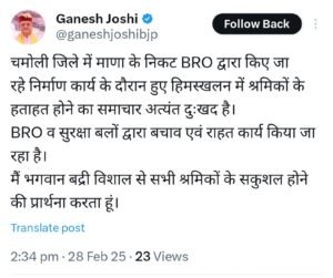 देहरादून: कैबिनेट मंत्री गणेश जोशी ने जनपद चमोली में माणा गांव के निकट बीआरओ द्वारा संचालित निर्माण कार्य के दौरान हिमस्खलन की वजह से दबे मजदूरों की भगवान बदरी विशाल से सुरक्षा और कुशलता की प्रार्थना की है। उन्होंने कहा कि हिमस्खलन की वजह से मजदूरों के दबने का दुःखद समाचार मिला है। ईश्वर से प्रार्थना है कि सभी श्रमिक सुरक्षित रहें। मंत्री ने कहा कि ITBP, BRO और अन्य बचाव दलों द्वारा राहत एवं बचाव कार्य किया जा रहा है। मंत्री गणेश जोशी ने कहा कि घटना की सूचना मिलते ही ITBP, BRO और अन्य बचाव दल मौके पर पहुंच गए हैं और राहत एवं बचाव कार्य में जुट गए हैं। उन्होंने कहा कि मुख्यमंत्री खुद घटना पर नजर बनाए हुए हैं और मजदूरों को सुरक्षित निकालने के लिए हरसंभव प्रयास किए जा रहे हैं।