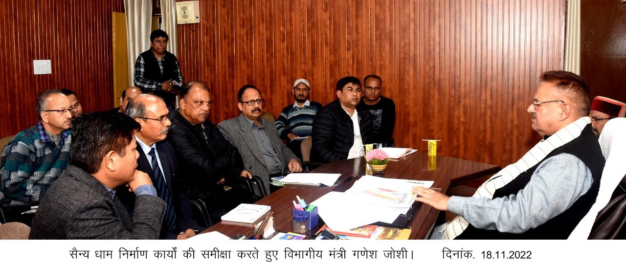सैनिक कल्याण मंत्री गणेश जोशी ने कहा कि सैन्य धाम को भव्य रूप दिया जा रहा है। उन्होंने कहा कि सरकार द्वारा देश के विभिन्न स्मारकों का अध्ययन करके सैन्य धाम के डिजाइन को अंतिम रूप दिया है। उन्होंने कहा कि विगत वर्ष में प्रदेश भर शहीद सम्मान यात्रा के दौरान प्रदेश के 1734 शहीद परिवारों के घर से मिट्टी एकत्र कर सैन्य धाम में बनाये जाने वाली अमर जवान ज्योति के नीचे रखा जायेगा। सैनिक कल्याण मंत्री गणेश जोशी ने कहा कि सैन्य धाम का मुख्य द्वार पर और उत्तराखण्ड के गौरव और देश के पहले सीडीएस जनरल विपिन रावत के नाम पर बनाया जायेगा। उन्होंने कहा नवंबर 2022 के अंत तक 28% निर्माण कार्य पूर्ण कर दिया जायेगा। इस अवसर पर बैठक में अपर सचिव सैनिक कल्याण चन्द्र सिंह धर्मसत्तू, उप जिलाधिकारी नरेश चन्द्र दुर्गापाल, संयुक्त सचिव सुनील सिंह तथा अन्य विभागीय अधिकारी उपस्थित रहे।