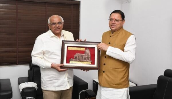 गांधीनगर : मुख्यमंत्री पुष्कर सिंह धामी के दो दिवसीय गुजरात – अहमदाबाद, दौरे पर आज प्रातः गांधीनगर में गुजरात के मुख्यमंत्री भूपेंद्र पटेल से शिष्टाचार भेंट कर उन्हें बाबा केदार का स्मृति चित्र भेंट किया। इस दौरान उनसे प्रवासी उत्तराखंडियों की माँग पर अहमदाबाद में उत्तराखण्ड भवन बनाए जाने के लिए सहयोग हेतु अनुरोध किया। साथ ही दोनों राज्यों में गतिमान विभिन्न विकास कार्यों पर चर्चा कर उन्हें देवभूमि भ्रमण हेतु आमंत्रित भी किया।
