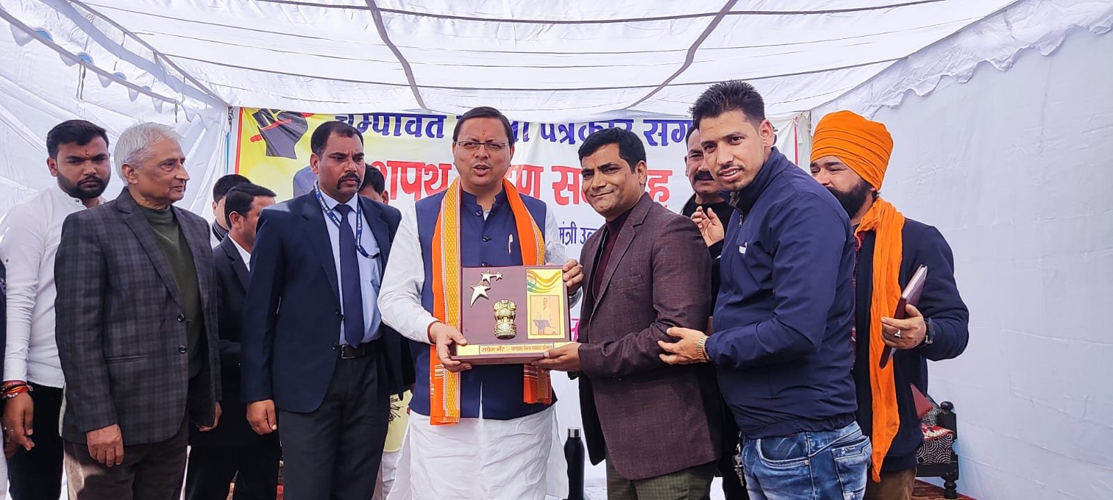 चम्पावत : मुख्यमंत्री पुष्कर सिंह धामी ने शनिवार को चंपावत जिला पत्रकार संगठन के निर्वाचित पदाधिकारियों अध्यक्ष कमलेश भट्ट, उपाध्यक्ष भगवान राम उर्फ हयात राम, सचिव दीपक धामी एवं कोषाध्यक्ष दिनेश भट्ट के शपथ ग्रहण समारोह में प्रतिभाग किया।मुख्यमंत्री ने शपथ ग्रहण समारोह कार्यक्रम का शुभारंभ किया और सभी नवनिर्वाचित पदाधिकारियों को हार्दिक बधाई एवं शुभकामनाएं दी। उन्होंने आशा व्यक्त की कि सभी पदाधिकारी अपने दायित्वों का निर्वहन भली भांती कर जिले के विकास में अपनी सहभागिता व सहयोग करेंगे।