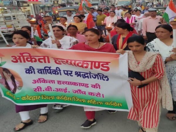 कोटद्वार । जिला व महिला कांग्रेस कार्यकर्ता सोमवार देर शाम को जिला महिला कांग्रेस अध्यक्ष रश्मि पटवाल के नेतृत्व में मालवीय उद्यान में एकत्रित हुए। तत्पश्चात वे मशाल जुलूस के साथ झंडाचौक पहुंचे और अंकिता के चित्र के सम्मुख कैंडल जलाकर श्रद्धांजलि दी। इस अवसर पर वक्ताओं ने कहा कि अंकिता भंडारी के जघन्य हत्याकांड को एक साल बीतने के बाद भी भाजपा सरकार पीड़ित परिवार को न्याय दिलाने में विफल रही है। कहा कि इस हत्याकांड का मुख्य आरोपी भाजपा के पूर्व राज्य मंत्री का बेटा है, इसलिए सरकार उसको बचाने की कोशिश कर रही है। मौके पर अंकिता हत्याकांड की सीबीआई जांच करवाकर उसके परिजनों को शीघ्र न्याय दिलाने की मांग की गई और ऐसा न होने पर आंदोलन की चेतावनी दी गई। इस अवसर पर प्रदेश महामंत्री पूनम कैंत्यूरा, प्रदेश सचिव नीलम रावत, बलबीर सिंह रावत, जिलाध्यक्ष विनोद डबराल, प्रवेश रावत, आशा चौहान, पिंकी नेगी, गोपाल गुसाई, अमित राज सिंह और शिवम भूषण सहित अन्य कार्यकर्ता मौजूद रहे।