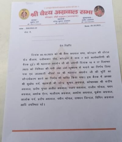 कोटद्वार । श्री वैश्य अग्रवाल सभा की बैठक नजीबाबाद रोड़ स्थित एक होटल में आयोजित की गई । जिसमें श्री महाराजा अग्रसेन जी की जयंती आगामी 16 व 17 दिसम्बर को निश्चित की गयी तथा जयंती को घूमधाम से मनाने का निर्णय लिया गया साथ ही लालबत्ती चौराहे पर श्री महाराज अग्रसेन जी की मूर्ति का सौन्दर्यकरण करने का भी निर्णय पारित किया गया। बैठक में अध्यक्ष सुबोध गर्ग, महामंत्री नरेन्द्र कुमार अग्रवाल, कोषाध्यक्ष संदीप अग्रवाल, प्रदीप गुप्ता अजीत अग्रवाल, रंजन अग्रवाल, राजीव गोयल, पवन अग्रवाल, अशोक ऐरन, मालीराम अग्रवाल, अवधेश अग्रवाल, मुकेश अग्रवाल, आलोक गर्ग, प्रदीप अग्रवाल, नवीन गोयल, रामधन जिन्दल, विपिन अग्रवाल आदि उपस्थित रहे।