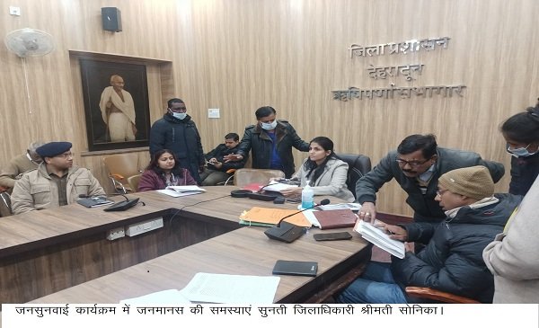 देहरादून : जिलाधिकारी सोनिका की अध्यक्षता में ऋषिपर्णा सभागार कलेक्ट्रेट में आज आयोजित जनसुनवाई में 113 शिकायतें प्राप्त हुए। जिनमें कई शिकायतों का मौके पर निस्तारण किया गया। जनसुनवाई में अधिकतर शिकायतें भूमि विवाद, अवैध अतिक्रमण, से संबंधित प्राप्त हुई इसके अतिरिक्त शस्त्र लाइसेंस बनवाने, अवैध वर्कशाॅप संचालित करने, सीवर लाइन में कनेक्शन दिलवाने, डाॅल बिटटे के नाम पर पेड़ काटे जाने, पुस्तेनी मकान में हिस्सा दिलाने, सड़क ठीक कराने, अवैध निर्माण आदि शिकायतें प्राप्त हुई।