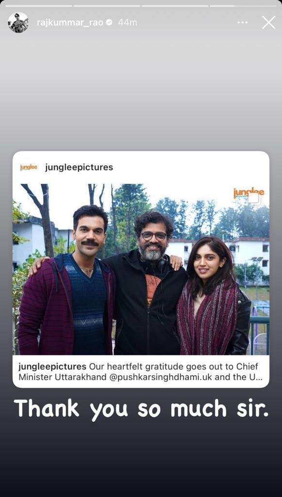 ‘‘मुख्यमंत्री पुष्कर सिंह धामी और उत्तराखण्ड फिल्म विकास परिषद का उनके सहयोग और गर्मजोशी से भरे आतिथ्य हेतु हार्दिक धन्यवाद। बधाई दो फिल्म के लिए शूटिंग की अनुमति देने से लेकर सब्सिडी स्वीकृत करने तक उनकी कार्यप्रणाली वास्तव में सराहनीय है। हम एब बार फिर सुरम्य राज्य उत्तराखण्ड में शूटिंग करने के अवसर का बेसब्री से इंतजार कर रहे हैं। जंगली पिक्चर्स के इस पोस्ट को बधाई दो के अभिनेता प्रसिद्ध स्टार राजकुमार राव ने अपनी इंस्टा स्टोरी पर शेयर करते हुए लिखा ‘‘धन्यवाद सर’’।
