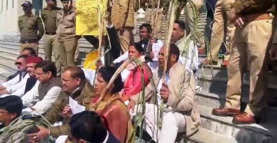 गैरसैण : कांग्रेस विधायकों ने गन्ने का समर्थन मूल्य घोषित करने की मांग को लेकर किया प्रदर्शन