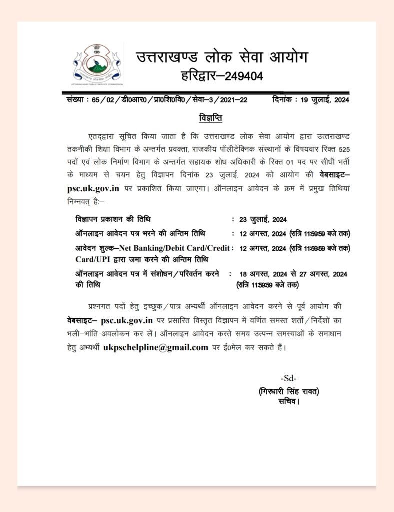 प्रश्नगत पदों हेतु इच्छुक/पात्र अभ्यर्थी ऑनलाइन आवेदन करने से पूर्व आयोग की वेबसाइट- psc.uk.gov.in पर प्रसारित विस्तृत विज्ञापन में वर्णित समस्त शर्तों / निर्देशों का भली-भांति अवलोकन कर लें। ऑनलाइन आवेदन करते समय उत्पन्न समस्याओं के समाधान हेतु अभ्यर्थी ukpschelpline@gmail.comपर ई०मेल कर सकते हैं।