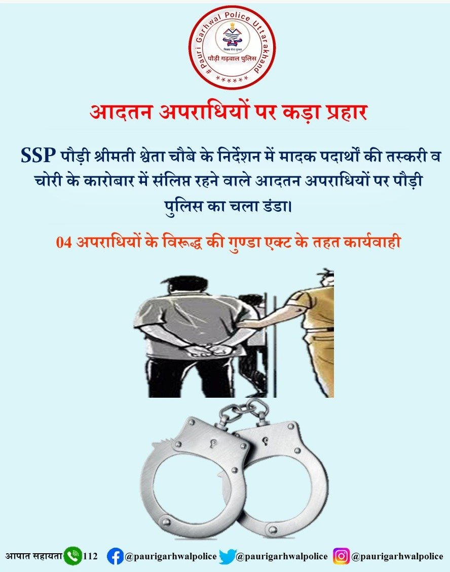 कोटद्वार । एसएसपी श्वेता चौबे के निर्देशन में मादक पदार्थों की तस्करी व चोरी के कारोबार में संलिप्त रहने वाले अपराधियों पर पौड़ी पुलिस ने गुण्डा एक्ट के तहत कार्यवाही की है । जनपद में आपराधिक गतिविधियों की रोकथाम, आदतन अपराधियों की निगरानी करने, भविष्य में आपराधिक गतिविधियों पर अंकुश लगाए जाने तथा अवैध गतिविधियों में संलिप्त आदतन अपराधियों के विरुद्ध कड़ी कार्यवाही करते हुए प्रभारी निरीक्षक विजय सिंह के नेतृत्व में कोतवाली कोटद्वार पुलिस ने करनैल सिंह पुत्र शेर सिंह निवासी-झूला बस्ती, गाडीघाट कोटद्वार, नदीम उर्फ बच्चा, पुत्र मौ0 बल्लन, निवासी-लकडी पडाव, राजेन्द्र कुमार पुत्र स्व नरेश कुमार, निवासी-प्रजापति नगर गाडीघाट व उत्तम सिंह पुत्र उम्मेद सिंह निवासी झण्डीचौड पूर्वी के विरूद्ध गुण्डा अधिनियम के तहत कार्यवाही की है ।