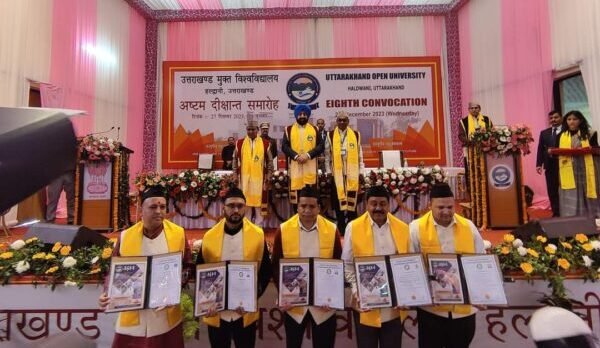 हल्द्वानी/ देहरादून : उत्तराखंड मुक्त विश्वविद्यालय के अष्टम दीक्षांत समरोह में राज्यपाल (रि.) लेफ्टिनेंट जनरल गुरमीत सिंह, मुख्यमंत्री पुष्कर सिंह धामी एवं उच्च शिक्षा मंत्री डॉ. धन सिंह रावत ने 21 छात्रों को विश्वविद्यालय स्वर्ण पदक, दो छात्रों को कुलाधिपति स्वर्ण पदक एवं तीन प्रायोजक स्वर्ण पदक प्रदान किये। इसके साथ ही पांच छात्रों को पीएचडी की उपाधि तथा विभिन्न विद्याशाखाओ में 15417 को स्नातक और स्नाकोत्तर की उपाधि प्रदान की गई। इस दौरान राज्यपाल एवं मुख्यमंत्री ने मुक्त विश्वविद्यालय के कॉसैप्ट की सराहना की, साथ ही उन्होंने सभी छात्रों के उज्ज्वल भविष्य की कामना की। उच्च शिक्षा मंत्री डॉ. धन सिंह रावत ने कहा कि उच्च शिक्षा के क्षेत्र में राज्य सरकार ने तीन बड़े कदम उठाये हैं जिसमें प्रत्येक छात्र-छात्राओं का अब डीजी लॉकर के माध्यम से डिग्रियां दी जायेगी। दूरस्थ शिक्षा में एडमिशन लेने वाले छात्र-छात्राओं को निःशुल्क पुस्तकें वितरित की जायेंगी। परीक्षा परिणाम समय पर घोषित हों इसके लिये प्रत्येक विश्वविद्यालयों में केन्द्रीय मूल्यांकन व्यवस्था लागू की जायेगी इसके लिये पीएम-रूसा से तहत विश्वविद्यालयों को 20-20 करोड़ की धनराशि आवंटित की जायेगी।