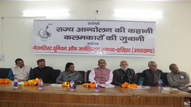 हरिद्वार। उत्तराखंड के मीडियाकर्मियों की प्रमुख संस्था ‘नेशनलिस्ट यूनियन आफ जर्नलिस्ट’ द्वारा यहां आयोजित एक संगोष्ठी में पत्रकारों ने राज्य आंदोलन में मीडिया कवरेज के अनुभव और आंदोलन में उनकी भूमिका पर विचार साझा किये। नेशनलिस्ट यूनियन ऑफ जर्नलिस्ट (एनयूजे उत्तराखंड) की हरिद्वार जनपद इकाई द्वारा राज्य आंदोलन की कहानी, कलमकारों की जुबानी विषय पर आयोजित संगोष्ठी में उत्तराखंड राज्य आंदोलन में अपनी लेखनी से योगदान देने वाले पत्रकार और राज्य आंदोलनकारी एक मंच पर जुटे। अतिथियों द्वारा दीप प्रज्जवल और उनके पुष्पाभिनन्दन के साथ आरंभ हुए कार्यक्रम में यूनियन के जिलाध्यक्ष प्रमोद कुमार पाल ने अपनी कार्यकारिणी के साथ अतिथियों का स्वागत करते हुए अतिथियों के सम्मान में स्वागत संबोधन प्रस्तुत किया।