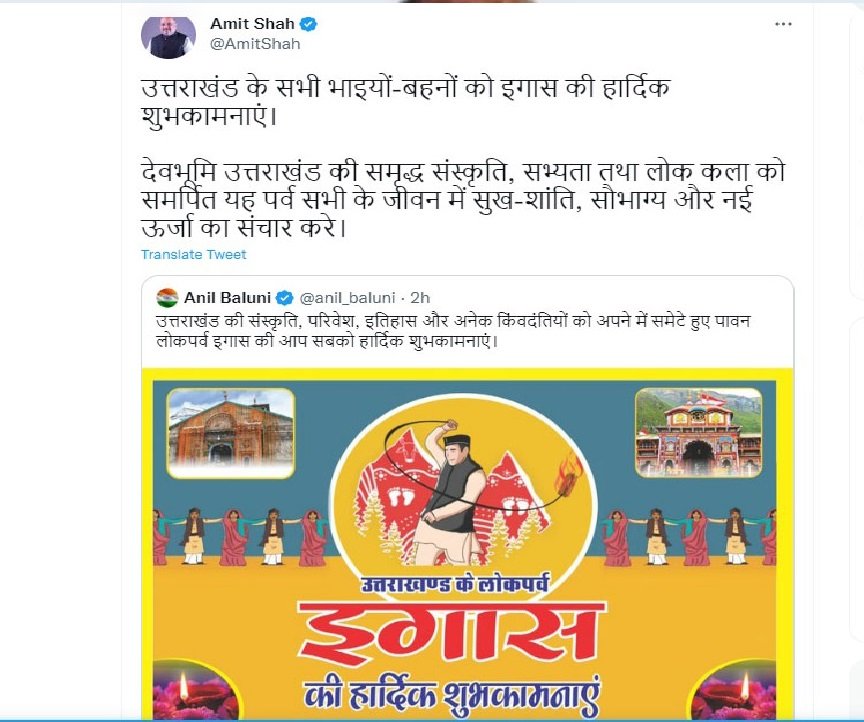 उत्तराखंड के लोक पर्व इगास पर गृहमंत्री अमित शाह सहित भाजपा सांसद अनिल बलूनी और प्रदेश भाजपा अध्यक्ष महेंद्र भट्ट ने भी शुभकामनाएं दी हैं। गृहमंत्री अमित शाह ने अपने संदेश में कहा है कि उत्तराखंड के सभी भाइयों-बहनों को इगास की हार्दिक शुभकामनाएं। देवभूमि उत्तराखंड की समृद्ध संस्कृति, सभ्यता और लोक कला को समर्पित यह पर्व सभी के जीवन में सुख-शांति, सौभाग्य और नई ऊर्जा का संचार करे।