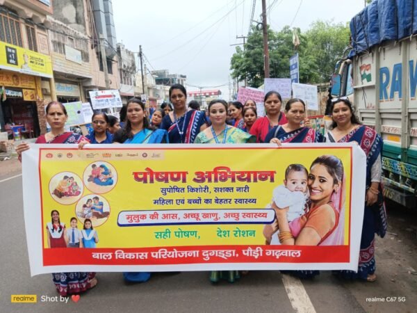 कोटद्वार । बाल विकास परियोजना दुगड्डा में पोषण अभियान के अन्तर्गत एक विशाल जन जागरूकता पोषण रैली का आयोजन किया गया। रैली को खण्ड विकास अधिकारी दुगड्डा विधादत्त रतूड़ी, नगर निगम इंस्पेक्टर सुनील चौधरी एवं विधानसभा अध्यक्ष के पीआरओ मणिराम शर्मा के द्वारा सामूहिक रूप से हरी झंडी दिखाकर रवाना किया गया । रैली का संचालन प्रभारी बाल विकास परियोजना अधिकारी शिवाली एवं बाल विकास विभाग सुपरवाइजर संतोषी गुसाईं के द्वारा किया गया। रैली कौडिया कैंप से प्रारंभ होकर नगर के मुख्य चौराहों लालबत्ती एवं झंडाचौक से होती हुई तहसील परिसर में पहुंचकर समाप्त हुई। जन जागरूकता रैली के माध्यम से बच्चों, गर्भवती महिलाओं, धात्री महिलाओं, किशोरियों को उनके बेहतर स्वास्थ्य, उचित पोषण एवं शिक्षा का संदेश दिया गया। रैली में नगर निगम क्षेत्र की समस्त आंगनवाडी कार्यकर्त्ताओं एवं सहायिकाओं के द्वारा पोषण सम्बंधी पोस्टर एवं नारों के द्वारा जनता को जागरुक किया गया।