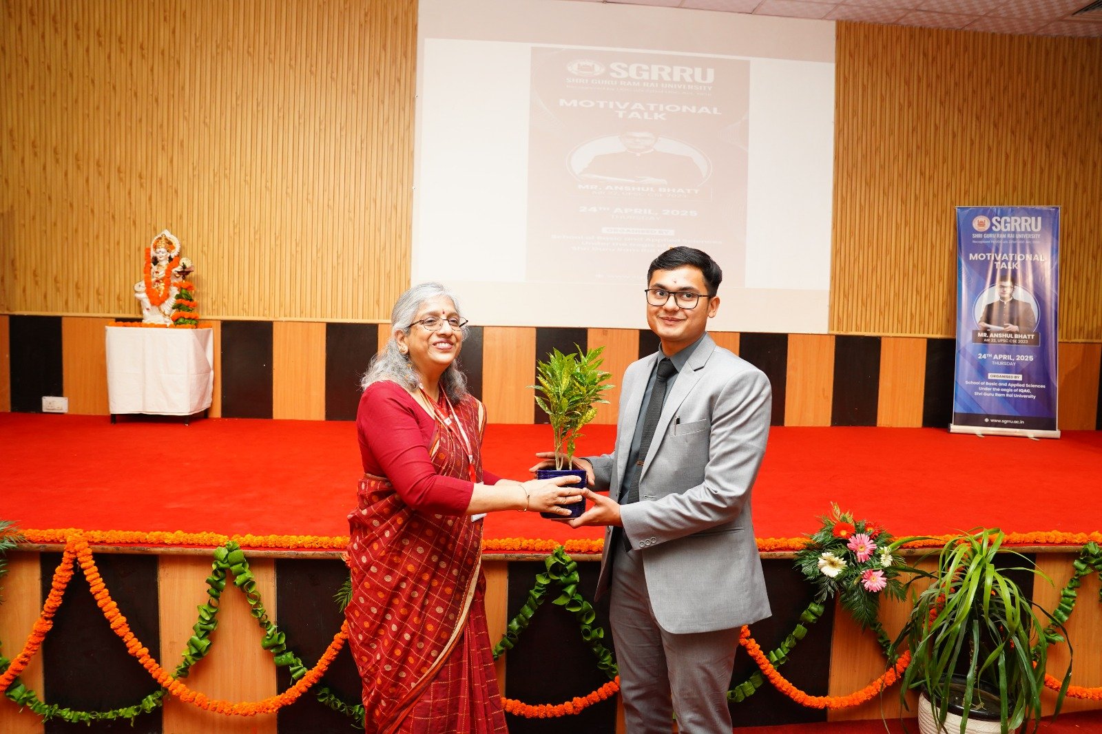 गुरुवार को श्री गुरु राम राय विश्वविद्यालय के पटेल नगर ऑडिटोरियम में प्रेरक वार्ता का आयोजन किया गया। एसजीआरआर विश्वविद्यालय की कुलपति (प्रो.) डाॅ कुमुद सकलानी ने मुख्य वक्ता के रूप में पधारे अंशुल भट्ट का स्वागत किया। उन्होंने कहा कि हर माता पिता का यह सपना होता है कि उनका बेटा आई.ए.एस. बने। अंशुल भट्ट की सफलता यह बताती है कि उनके अथक प्रयासों ने उन्हें यह मुकाम हासिल करने में महत्वपूर्ण भूमिका निभाई। अंशुल भट्ट के जैसे होनहार छात्र आज के युवाओं के लिए रोल माॅडल हैं। काबिलेगौर है कि अंशुल भट्ट की यह यात्रा प्रेरणादायक रही है। वे अब तक पौड़ी, हरिद्वार, रुड़की, अल्मोड़ा, हल्द्वानी, काशीपुर और रुद्रपुर जैसे विभिन्न शहरों के 10 अलग-अलग स्कूलों में पढ़ चुके हैं। 12वीं कक्षा में उन्होंने 99 प्रतिशत अंक प्राप्त किए थे। स्नातक उन्होंने दिल्ली विश्वविद्यालय के सेंट स्टीफेंस कॉलेज से किया, जहाँ वे कई छात्र प्रतिनिधित्व पदों पर रहे।