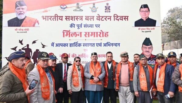 देहरादून : सैनिक कल्याण मंत्री गणेश जोशी द्वारा भारतीय सहस्त्र बल वेटरन दिवस की पूर्व संध्या पर मिलन समारोह कार्यक्रम आयोजित किया गया। इस अवसर पर सैनिक कल्याण मंत्री गणेश जोशी ने वैटनर्स डे में वीरता पदक धारकों तथा वयोवृद्ध सैनिकों को श्रीराम का पटका पहनाकर सम्मानित किया तथा नए वर्ष की डायरी भेंट की।