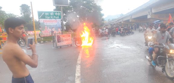हरिद्वार। यहां कांवड़ लेना आए एक कांवडि़या हादसा का शिकार हो गया। चलती हुई बाइक में अचानक आग लगने से बाइक जलकर राख हो गई। गनीमत रहीं की कांवडि़ए को कोई क्षति नहीं पहुंची। जानकारी के मुताबिक शनिवार की अलसुबह कनखल के शंकराचार्य चौक पर एक कावडि़ए की मोटरसाइकिल में अचानक आग लग गई। बाइक में आग लगते ही वहां मौजूद पुलिसकर्मियों ने आसपास का स्थान खाली करवाया और फायर कर्मियों को बुलाकर आग पर काबू पाया। जब तक बाइक में लगी आग पर काबू पाया गया, बाइक जलकरर राख हो गई।