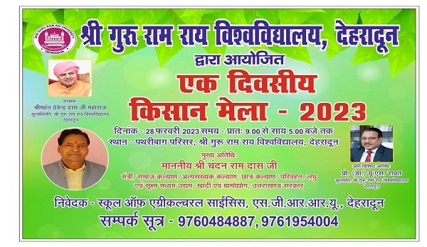 देहरादून। श्री गुरु राम राय विश्वविद्यालय में मंगलवार 28 फरवरी को किसान मेला आयोजित हो रहा है। किसान मेले में उत्तराखण्ड के विभिन्न हिस्सों से किसान अपने उत्पादों की प्रदर्शनी व बिक्री के लिए पहुंच रहे हैं। किसानों को राष्ट्रीयकृत बैंक की ओर से कृर्षि और सरकारी कृषि योजनाओं की जानकारी दी जाएगी। यह जानकारी किसान मेला के समन्वयक डॉ दीपक सोम ने दी। मंगलवार को श्री गुरु राम राय विश्वविद्यालय के पथरी बाग कैंपस में लघु एवम् सूक्ष्म उद्योग मंत्री, उत्तराखण्ड चन्दन राम दास किसान मेले का शुभारंभ करेंगे। श्री गुरु राम राय विश्वविद्यालय की ओर से किसानो एवम उद्यमियों को 50 से अधिक स्टाल्स निःशुल्क उपलब्ध करवाए गए हैं। श्री गुरु राम राम विश्वविद्यालय के कृषि विभाग के डॉ दीपक सोम ने जानकारी दी कि किसान मेले का उद्देश्य उत्तराखण्ड के किसानों को आधुनिक किसानी की बारीकियों से रूबरू करवाना, किसानों को उनके उत्पादों की बिक्री के लिए मंच प्रदान करना एवम् कृषि सम्बन्धित जानकारियों से अवगत कराना हैं। मेले के दौरान कृषि वैज्ञानिक भी मौजूद रहेंगे, पशु चिकत्सक किसानों को पशुओं की देखरेख व बीमारियों से बचाव की जानकारी भी देंगे।