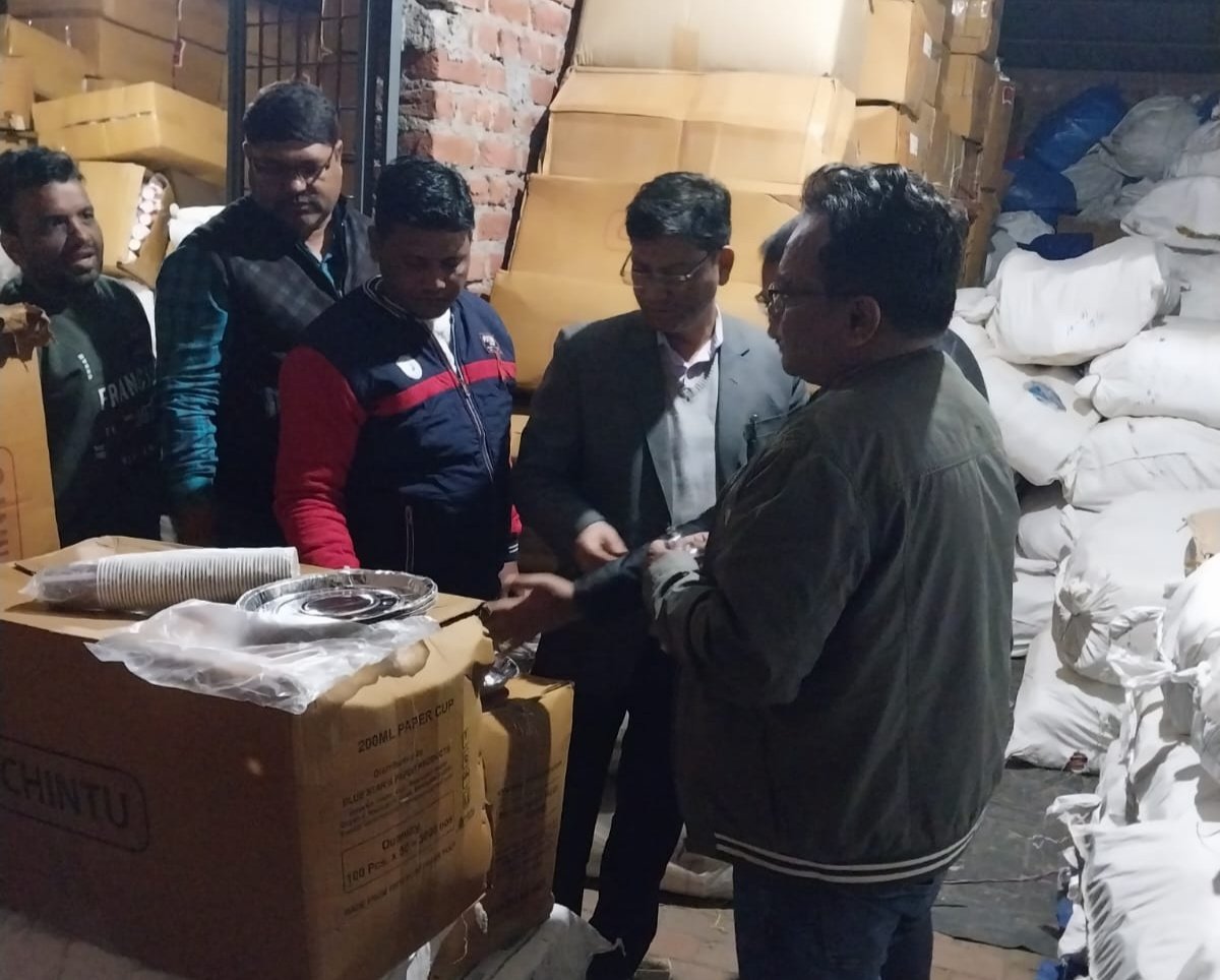 उपजिलाधिकारी ने कहा कि विनय अग्रवाल की दुकान के भूतल से लगभग 65 बैग कपड़े की थैलियां, 25 बैग प्लॉस्टिक की थैलियां, 25 बैग प्लॉस्टिक चम्मच, 60 पेटी प्लास्टिक कटोरी, 30 बंडल प्लॉस्टिक के गिलास, प्रथम तल से काली प्लास्टिक पॉलीथीन, 10 बैग पीपी तथा द्वितीय तल में स्ट्रा पाइप प्लॉस्टिक 14 पैकेट, 12 बडे बैग प्लॉस्टिक गिलास, 11 नग बड़े बैग स्ट्रा पाइप(ब्लू), 22 बैग प्लॉस्टिक चम्मच, 5 बड़े बैग सिंगल यूज प्लॉस्टिक, 3 बैग प्लॉस्टिक बॉक्स, 12 बड़े बैग थर्माकॉल प्लेट व 45 बड़े बैग दूध वाली पन्नी बरामद हुई।