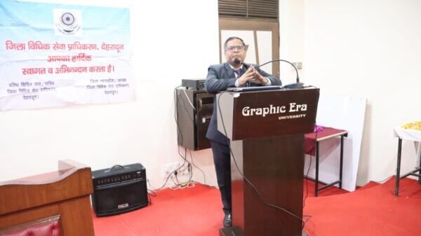 देहरादून : मानविकी एवं सामाजिक विज्ञान विभाग, ग्राफिक एरा डीम्ड युनिवर्सिटी, देहरादून द्वारा आज सेमिनार हॉल मे जिला विधिक सेवा प्राधिकरण, देहरादून के सहयोग से भारत में किशोर न्याय व्यवस्था विषय पर एक विधिक जागरूकता शिविर आयोजित किया गया, कार्यक्रम का शुभारंभ सिविल जज (वरिष्ठ प्रभाग)/सचिव, जिला विधिक सेवा प्राधिकरण, देहरादून हर्ष यादव एवं विभागाध्यक्ष डॉ. प्रभा लामा व अन्य द्वारा दीप प्रज्जवलन कर किया।