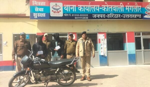 मंगलौर/हरिद्वार : कोतवाली मंगलौर पर 27 जुलाई 2023 को वादी संदीप निवासी देवबंद जिला सहारनपुर द्वारा स्वयं की मोटरसाइकिल स्प्लेंडर नंबर UP11CD 1926 मय 76000 अन्य कार्ड छीन कर ले जाने के संबंध में अन्तर्गत धारा 392 504 आईपीसी बनाम अज्ञात तीन बदमाश पंजीकृत कराया गया, विवेचना के दौरान मुकदमा उपरोक्त को धारा 394, 120 बी आईपीसी में तरमीम किया गया। लूट जैसी जघन्य अपराध के अनावरण हेतु एसएसपी हरिद्वार द्वारा मुकदमा उपरोक्त के अनावरण हेतु टीमों का गठन करवाया गया। पुलिस टीम द्वारा पूर्व में ऐसे अपराधी जो ऐसी घटना कारित कर चुके हैं के सत्यापन एवं अन्य संसाधनों के माध्यम से गठित टीम को 22 अक्टूबर 2023 सफलता हाथ लगी, टीम द्वारा 22 अक्टूबर 2023 को दो अभियुक्त को लंढोरा क्षेत्र सोनाली पुल से गिरफ्तार किया गया जिनके कब्जे से निम्न लूटी मोटरसाइकिल तथा लुटे हुए पैसे बरामद हुए हैं । अभियुक्तों के अपराधिक इतिहास की जानकारी कर अन्य विधि कार्रवाई की जा रही है।