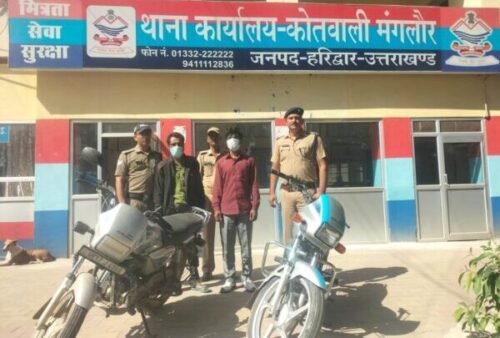 मंगलौर : जनपद में संदिग्ध व्यक्तियों/ वाहनों की चैकिंग हेतु चलाए जा रहे अभियान के क्रम में 20 अक्टूबर 2023 को कोतवाली मंगलौर पुलिस की चेैकिंग टीम द्वारा ई चालान मशीन से चैकिंग के दौरान कोतवाली मंगलौर पर वर्ष 2022 में धारा 379 आईपीसी बनाम अज्ञात में पंजीकृत से संबंधित चोरी मोटरसाइकिल को नंबर तस्दीक होने पर चोरों के कब्जे/ निशां देही से बरामद किया गया। अभियुक्तों के कब्जे से कोतवाली गंगनहर पर पंजीकृत अंतर्गत धारा 379 आईपीसी से संबंधित मोटरसाइकिल भी बरामद की गई हैं।