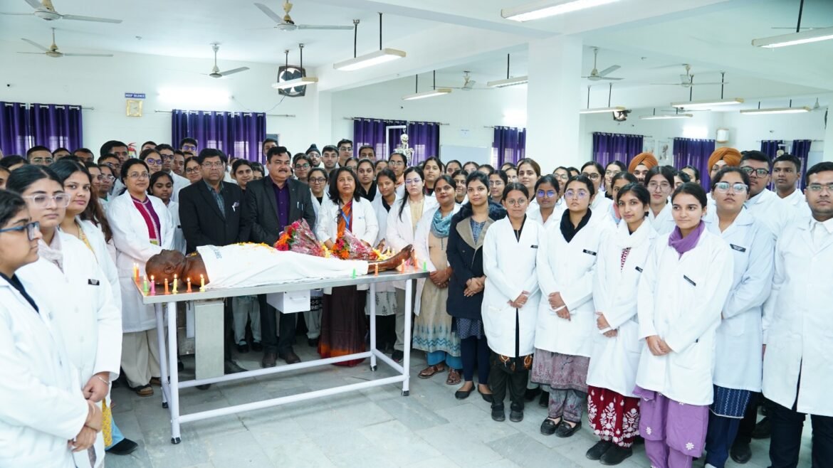 देहरादून। श्री गुरु राम राय इंस्टीट्यूट ऑफ मेडिकल एण्ड हैल्थ साइंसेज के एनाटमी विभाग में कैडेवर ओथ समारोह का आयोजन किया गया। मेडिकल पढ़ाई के लिए इस्तेमाल की जाने वाली संरक्षित मृत देह को मेडिकल भाषा में कैडेवर कहा जाता है। मेडिकल काॅलेज के छात्र-छात्राओं ने कैडेवेरिक शपथ लेते हुए देहदान के प्रति जागरूक किया। एमबीबीएस के सैकड़ों छात्र-छात्राओं ने कार्यक्रम में प्रतिभाग किया।