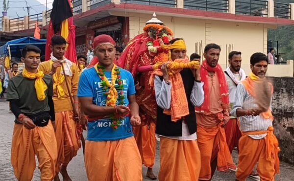 गोपेश्वर (चमोली)। नागपुर पट्टी के पोखरी विकास खण्ड के कुमेड़ा गांव की आराध्य देवी मां राजराजेश्वरी इंद्रामती की डोली भगवान बद्रीविशाल के दर्शन कर वापसी में गुरूवार को अपनी धियाण से मिलने कोठियालसैण पहुंची।