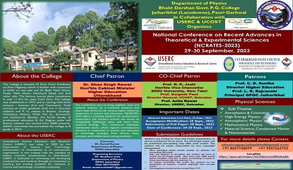 इस अवसर पर गढ़वाल केंद्रीय विश्वविद्यालय, दिल्ली विश्वविद्यालय, आई.एन.एस.टी. मोहाली चंडीगढ़, यूसर्क, उत्तराखण्ड अंतरिक्ष अनुप्रयोग केंद्र, वाडिया हिमालयन भूविज्ञान संस्थान तथा आर्यभट्ट प्रेक्षण विज्ञान शोध संस्थान (एरीज़) के वरिष्ठ वैज्ञानिक एवं प्रोफेसर मुख्य वक्ता के रूप में व्याख्यान प्रस्तुत करेंगे। कांफ्रेंस के आयोजन सचिव डॉ. शुभम काला ने बताया कि कांफ्रेंस चार तकनीकी सत्रों में संपन्न होगी जिसमें मुख्यतः भौतिकी तथा रसायन, गणित एवं पर्यावरण विज्ञान सम्मिलित है। कांफ्रेंस में उत्कृष्ट शोध पत्र प्रस्तुत करने वाले शोधार्थी को युवा वैज्ञानिक पुरस्कार प्रदत्त किया जाएगा। कांफ्रेंस के संयोजक डॉ. कमल कुमार ने बताया कि महाविद्यालय के भौतिक विज्ञान विभाग द्वारा आयोजित कांफ्रेंस हेतु पंजीकरण प्रक्रिया प्रारंभ हो चुकी है एवं पंजीकरण तथा कांफ्रेंस संबंधी समस्त विस्तृत जानकारी महाविद्यालय की वेबसाइट www.gpgcjaiharikhal.ac.in पर उपलब्ध है। महाविद्यालय की प्राचार्या प्रोo एलoआरo राजवंशी ने कहा की राष्ट्रीय स्तर की कांफ्रेंस निश्चित रूप से पर्वतीय क्षेत्र में शोध कार्यों को प्रोत्साहित करने तथा शोधार्थियों को राष्ट्रीय स्तर सहकार्यता हेतु नये अवसर प्रदान करेगी।