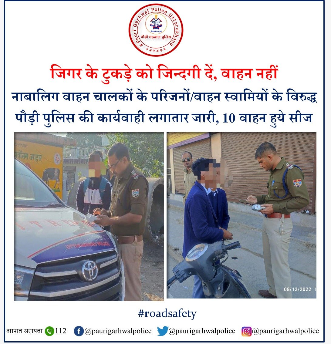 पौड़ी : पुलिस मुख्यालय के आदेशानुसार नाबालिग के अभिभावकों के विरूद्ध मोटर वाहन अधिनियम 1988 (संशोधित 2019) की धारा 199A (1) के अन्तर्गत के तहत कार्यवाही किये जाने के क्रम में वरिष्ठ पुलिस अधीक्षक श्वेता चौबे द्वारा जनपद के समस्त थाना प्रभारियों को उनके थाना क्षेत्रों में नाबालिगों द्वारा वाहन चलाने पर उनके अभिभावकों एवं वाहन स्वामियों विरूद्ध अभियान चलाकर कार्यवाही किये जाने हेतु कड़े निर्देश दिए गए हैं| अभियान के क्रम में 05 दिसम्बर 2022 से अब तक जनपद (श्रीनगर-03, पौड़ी-01, कोटद्वार-02, यातायात कोटद्वार/श्रीनगर-04) में 10 किशोर वाहन चालकों को वाहन चलाते हुए पाए जाने पर उनके अभिभावकों/वाहन स्वामी के विरूद्ध चालानी कार्यवाही करते हुए वाहनों को मौके पर ही नियमानुसार मोटर वाहन अधिनियम के अन्तर्गत सीज किया गया। उक्त अभियान लगातार जारी है।