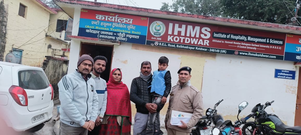 कोटद्वार । वरिष्ठ पुलिस अधीक्षक, पौड़ी श्वेता चौबे ने अधीनस्थ कार्मिकों को आमजन की सहायता के लिये प्रोत्साहित किया है। जिसके क्रम में गुरुवार को एएचटीयू कोटद्वार को सूचना प्राप्त हुई कि एक बालक लावारिश हालात में पटेल मार्ग चौराहा कोटद्वार पर सब्जी की दुकान के पास रो रहा है। सूचना पर एएचटीयू टीम तत्काल मौके पर पहुँची और बालक को अपनेपन का अहसास दिलाकर बालक को प्यार से गोद में उठाकर एएचटीयू कोटद्वार शाखा लाकर परिजनों के सम्बन्ध से पूछताछ की गई तो बालक केवल अपना नाम अरहान तथा अपने मामू की शादी में आना बता रहा था। तत्पश्चात पुलिस टीम ने बालक का फोटो खींचकर, तलाश करते हुए गुरुनानक वेडिंग प्वाइंट कोटद्वार के पास पहुँचे तो ऐसा प्रतीत हो रहा था कि दो महिलायें किसी की तलाश करते हुये परेशान नजर आ रही थी। पुलिस टीम ने उनके पास जाकर परेशानी का कारण पूछा तो महिला ने बताया कि मेरा नाम नसीमा बानो है, हम कोटद्वार शादी में आए हुए थे, रास्ते में अचानक उनका पोता कहीं खो गया है। हम लोग काफी समय से उसकी तलाश कर रहे हैं। तत्पश्चात पुलिस टीम ने फोन के माध्यम से बालक की दादी को बालक का फोटो दिखाया तो बालक की दादी व अन्य परिजनों ने बालक को पहचानकर बताया कि यह ही हमारा पोता मोहम्मद अरहान है। जिस पर पुलिस टीम ने बालक के परिजनों को एएचटीयू कार्यालय लाकर बालक को सीडब्लूसी के समक्ष पेश कर आवश्यक कार्यवाही कर सकुशल परिजनों के सुपुर्द किया गया। परिजनों ने पुलिस के इस किये गए नेक कार्य की सराहना कर धन्यवाद ज्ञापित किया । पुलिस टीम में अपर उप निरीक्षक कृपाल सिंह, आरक्षी मुकेश कुमार व आरक्षी सतपाल शर्मा मौजूद रहे ।