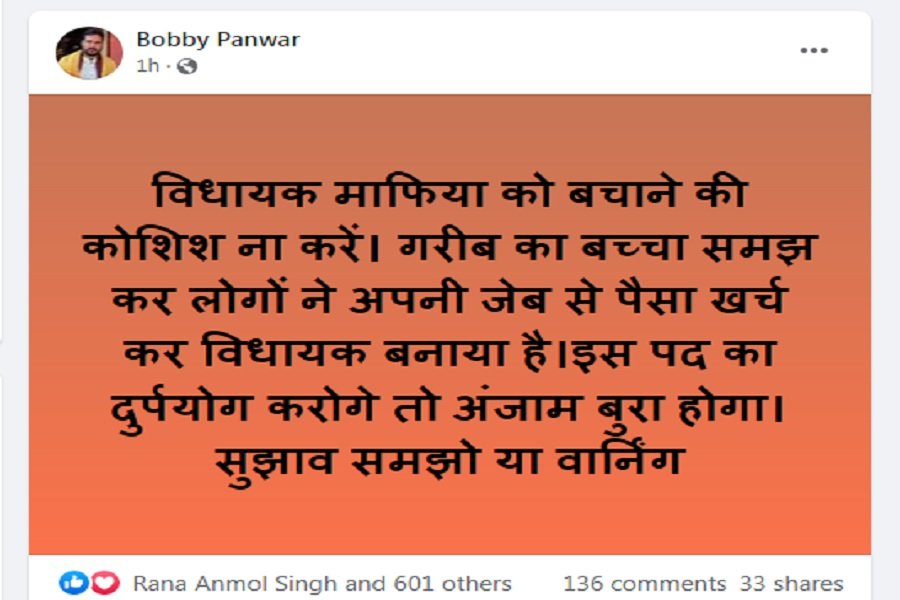उन्होंने लिखा है कि पेपर लीक मामले के आरोपी को बचाने का विधायक प्रयास ना करें। लोगों गरीब का बच्चा समझकर अपना पैसा लगाकर विधायक बनाया है। यह पोस्ट अब तेजी से वायरल हो रही है। कई व्हाट्सएप ग्रुपों में भी शेयर की जा रही है। इस पोस्ट के सामने आने के बाद अब विधायक भी निशाने पर आ गए हैं।