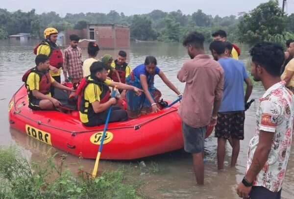 सितारगंज : जनपद उधमसिंहनगर के सितारगंज के अरविन्द नगर क्षेत्र में जलभराव से घरों में फंसे लोग, SDRF ने चलाया राहत बचाव अभियान। आज 09 अगस्त 2023 को प्रातः जिला आपदा प्रबंधन अधिकारी, रुद्रपुर जनपद उधमसिंहनगर द्वारा SDRF टीम को सूचित किया गया कि सितारगंज के अरविन्दनगर क्षेत्र में अत्यधिक जलभराव से लोगो के घरों में पानी भर गया है, जिन्हें सुरक्षित निकालने हेतु SDRF टीम की आवश्यकता है। उक्त सूचना प्राप्त होते ही SDRF रेस्क्यू टीम मुख्य आरक्षी खीम सिंह के हमराह मय राफ्ट व अन्य आवश्यक रेस्क्यू उपकरणों के तत्काल घटनास्थल के लिए रवाना हुई। SDRF टीम द्वारा घटनास्थल पर पहुँचकर त्वरित कार्यवाही करते हुए राफ्ट की सहायता से जलमग्न मकानों में से लगभग 200 लोगो को रेस्क्यू कर सकुशल सुरक्षित स्थान पर पहुँचाया गया।